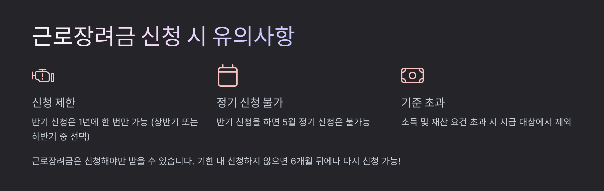 📢 근로장려금은 신청해야만 받을 수 있습니다. 기한 내 신청하지 않으면 6개월 뒤에나 다시 신청 가능!