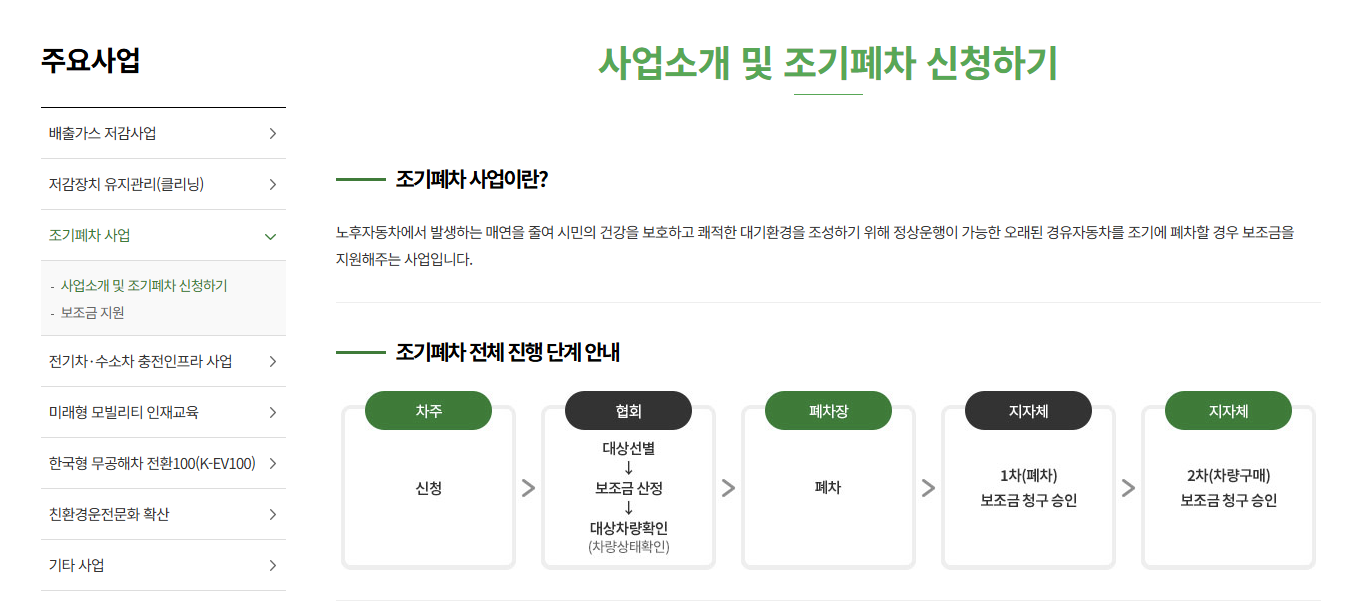 노후 경유 차량에서 배출되는 미세먼지를 줄이기 위해 정부와 지자체가 조기 폐차 시 보조금을 지급하는 제도입니다.