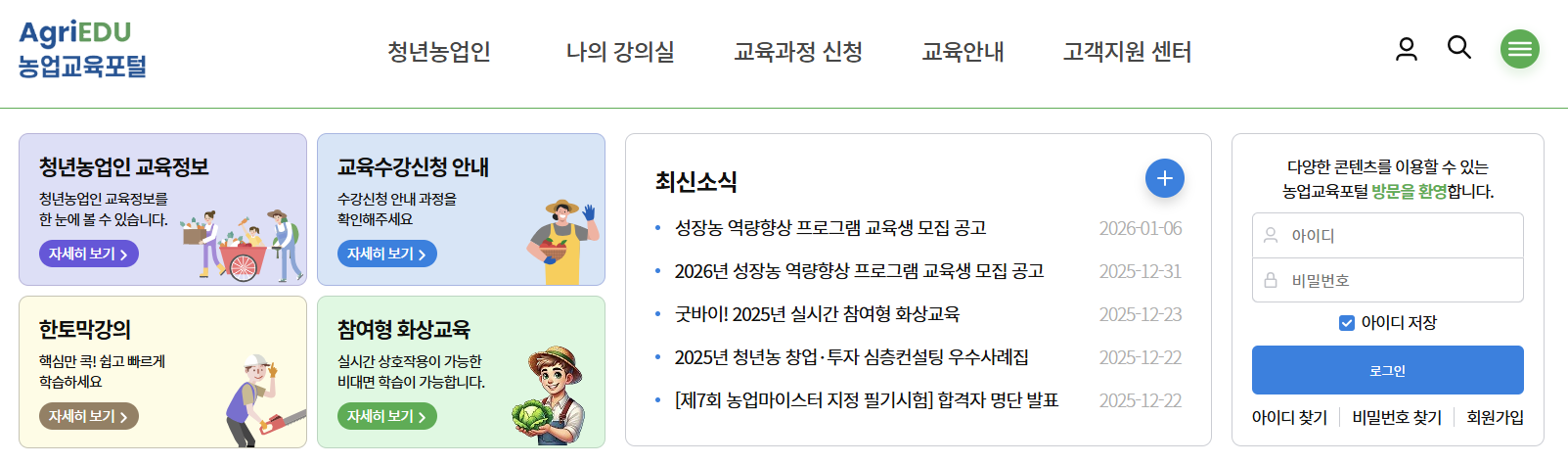 농업교육포털은 농업인·귀농귀촌 예정자·청년농업인까지 모두를 위한 국가 공식 농업 교육 플랫폼으로, 신뢰도 높은 교육 정보를 한곳에 모아 제공합니다.
