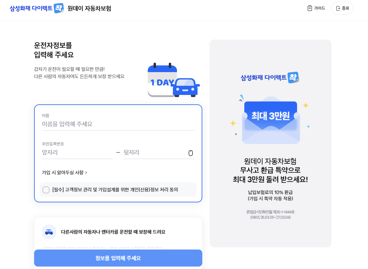 삼성화재 1일 자동차보험 가입방법, 가격, 환급 총정리