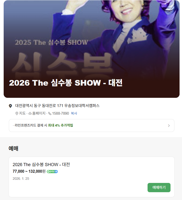 → “The 심수봉 SHOW – 대전” 공연 페이지에서 예매 진행
