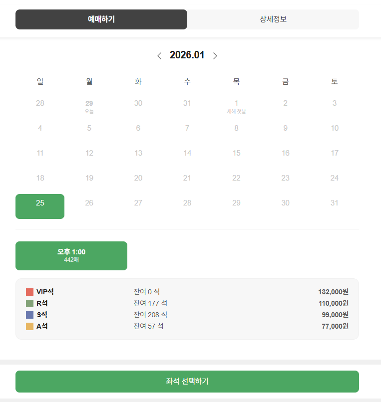※ 실제 가격 및 잔여 좌석은 예매 시점에 따라 달라질 수 있으므로 예매 페이지에서 최종 확인이 필요합니다.