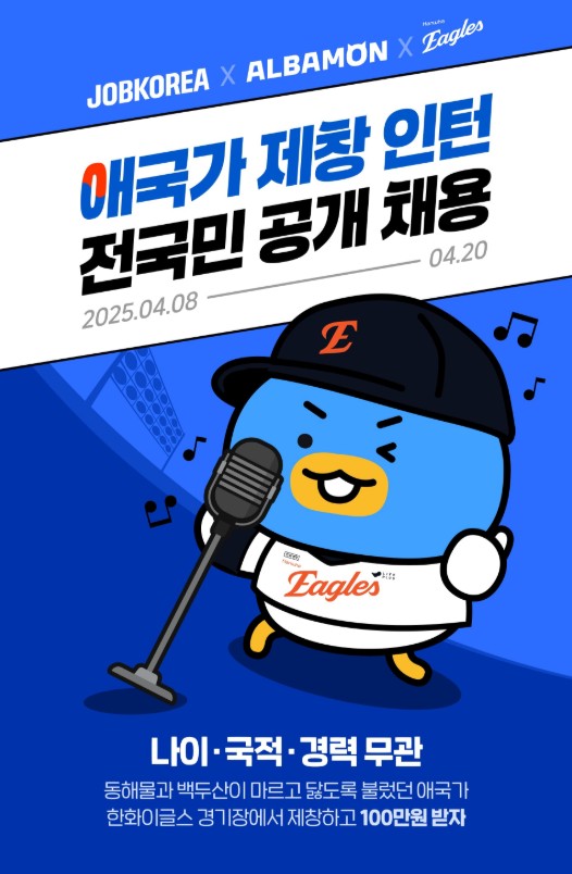잡코리아와 알바몬이 한화이글스와 함께 "일급 백만원 애국가 제창 인턴"을 모집합니다.