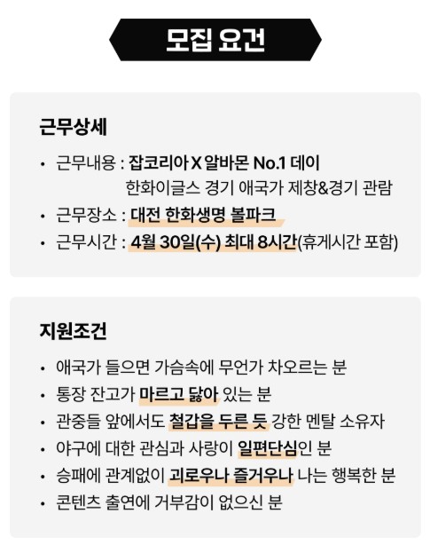 잡코리아 한화이글스 일급 100만원 애국가 제창 알바