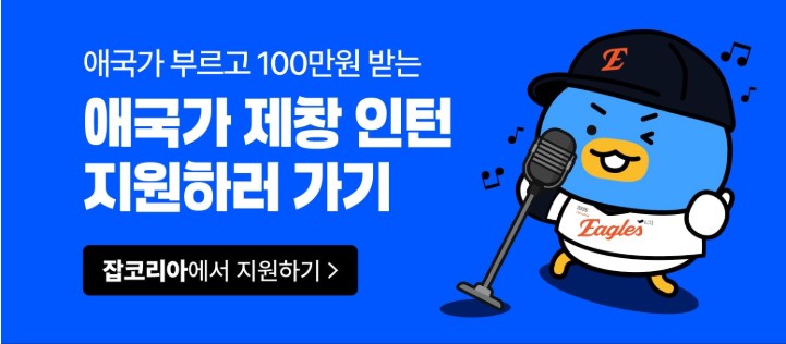 | 모집명 | 잡코리아 X 한화이글스 - 일급 백만원 애국가 제창 인턴 |