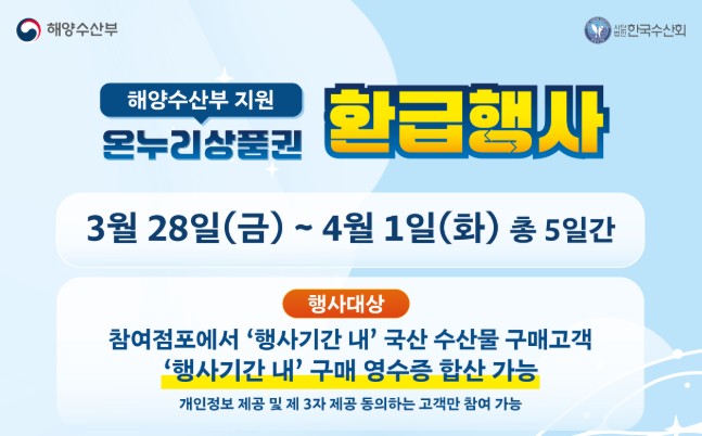 ✔ 참여 방법: 행사 기간 내 국산 수산물을 구매하고 영수증을 제출하면 환급 적용!