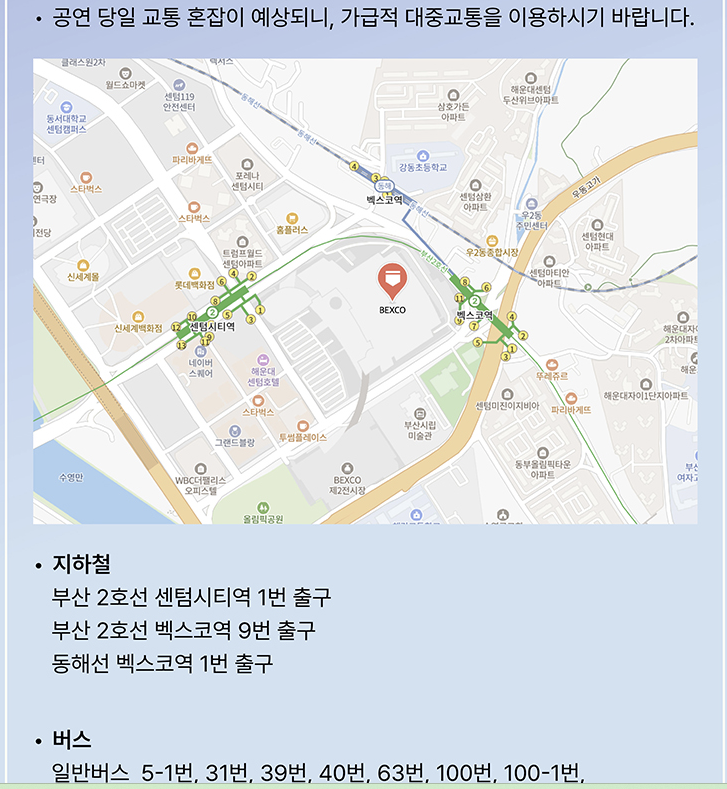 이번 콘서트는 부산 벡스코 제1전시장 1홀에서 진행됩니다.