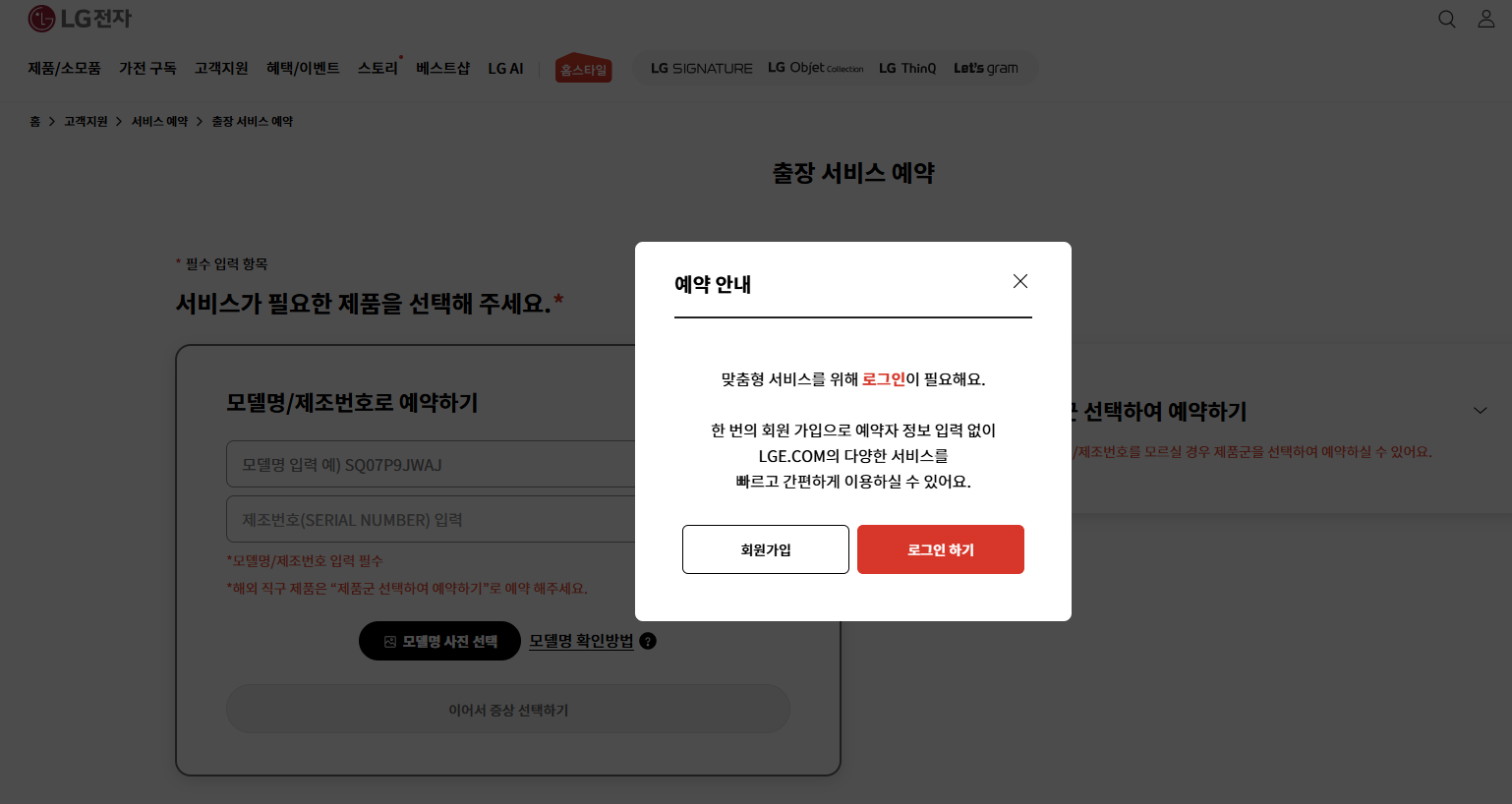 - 고객지원 → 서비스 예약 선택