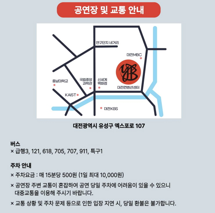 대전컨벤션센터 제1전시장은 대규모 공연에 적합한 공간으로, YB 특유의 묵직한 밴드 사운드를 안정적으로 즐길 수 있는 환경을 제공합니다.